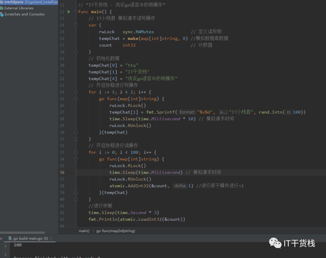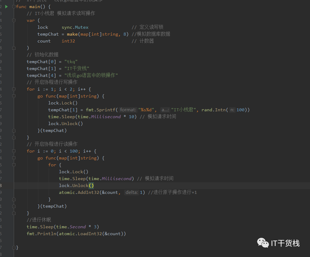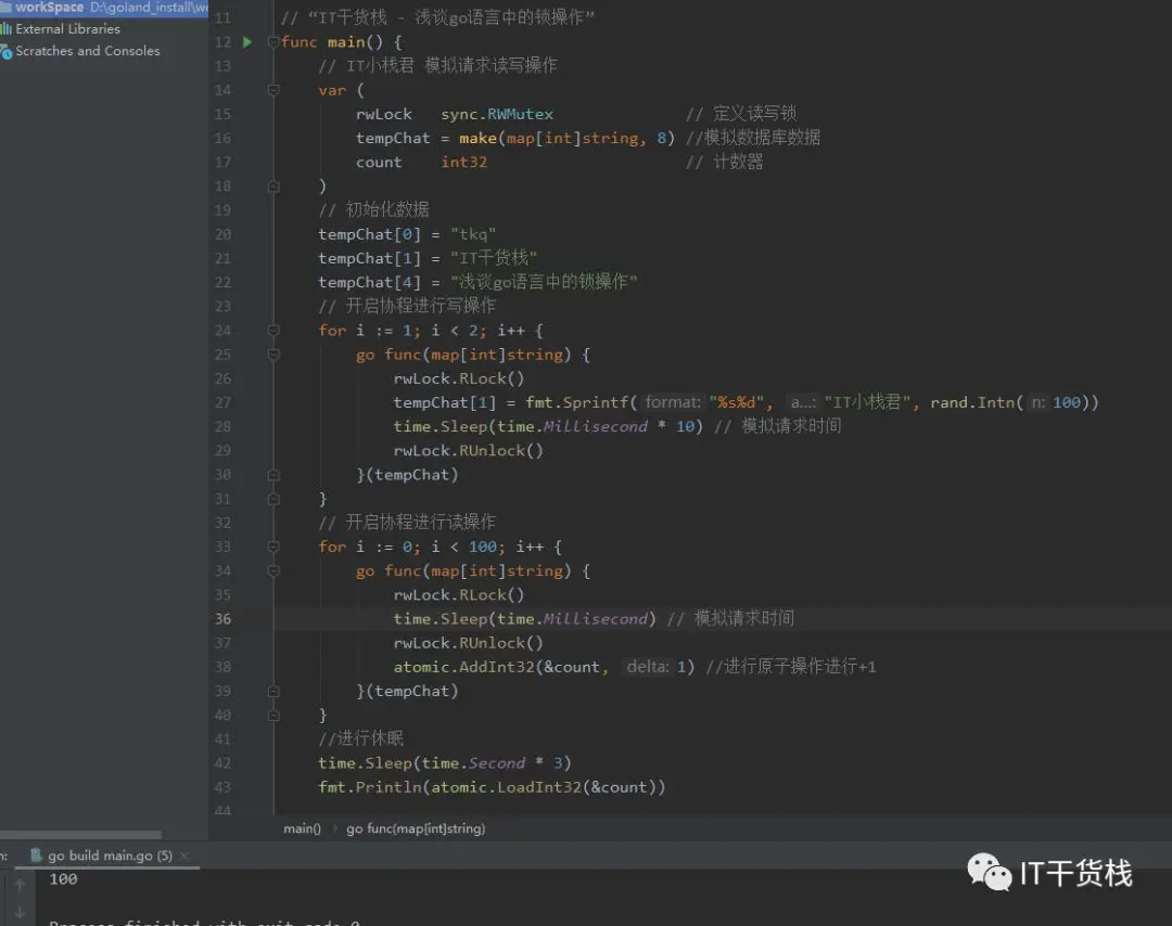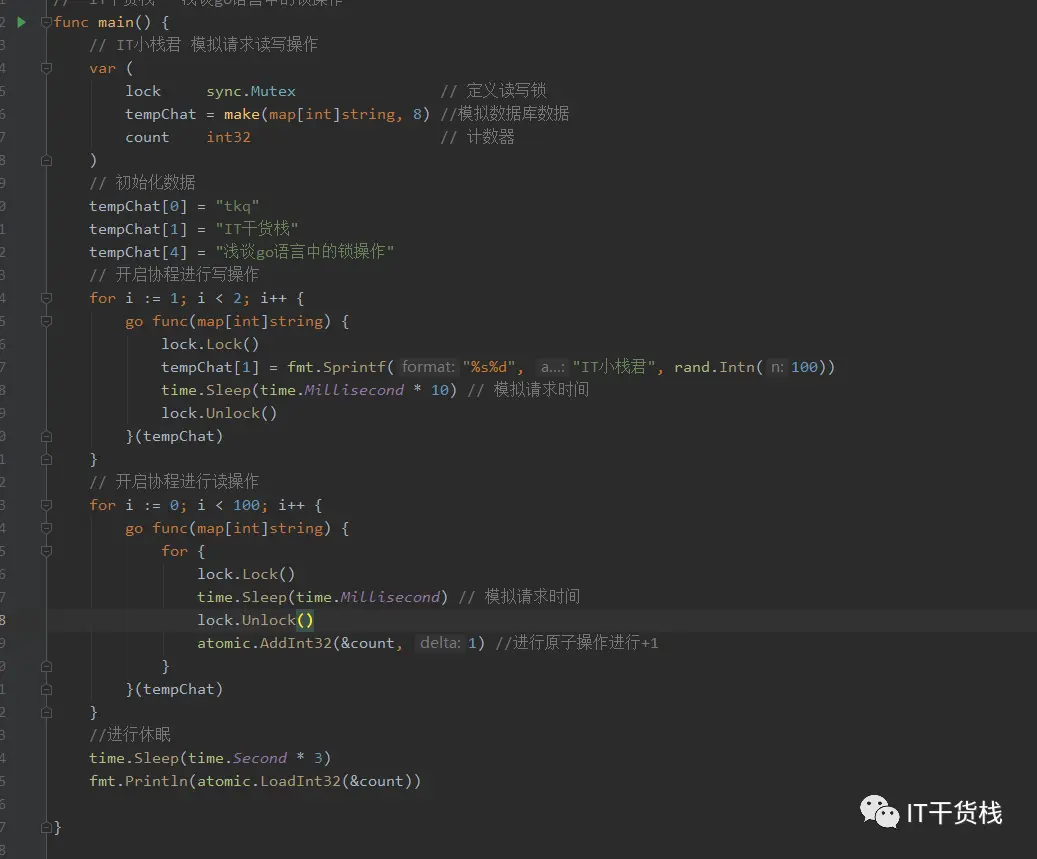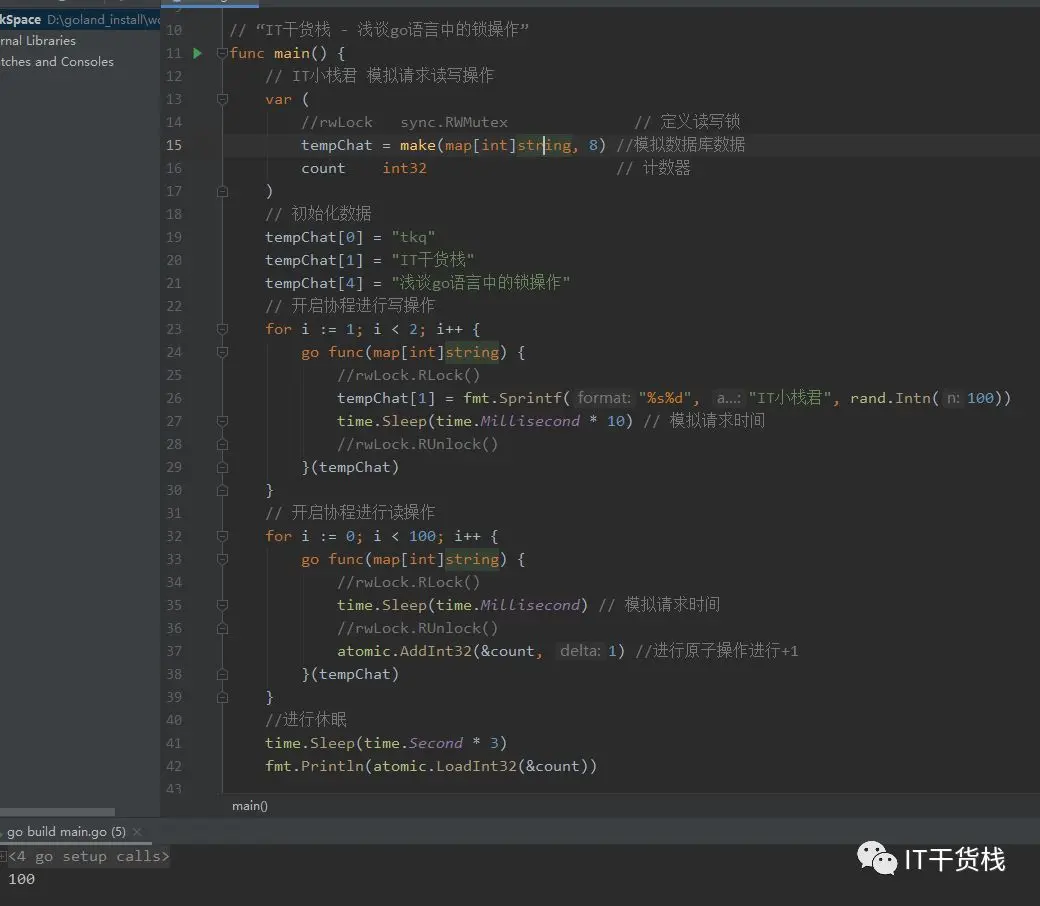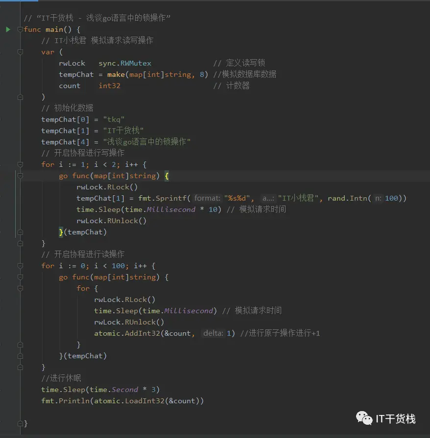我们先定义读写锁、数据库数据、还有相关的原子计数器。 这里有一个小知识点,我们在计数的时候用了atomic,这样可以保证计数的准确和安全。 然后开启了一个写协程和一百个读协程。