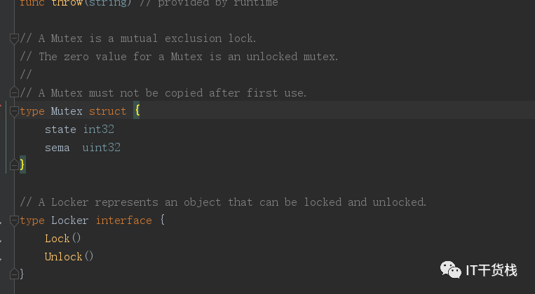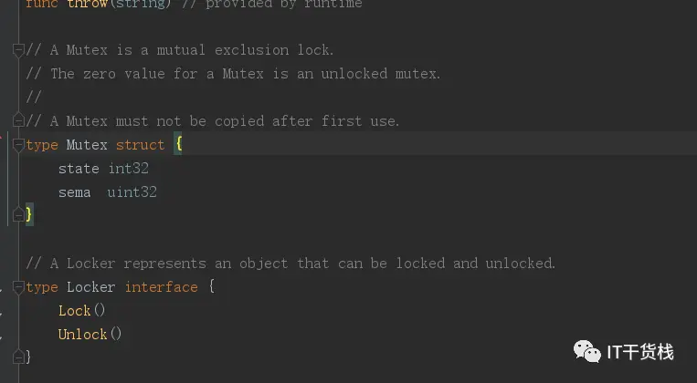 在go语言的sync包中也是有对于互斥锁的解释,互斥锁的结构体很简单,并且他的接口就只有一个加锁和一个解锁操作。