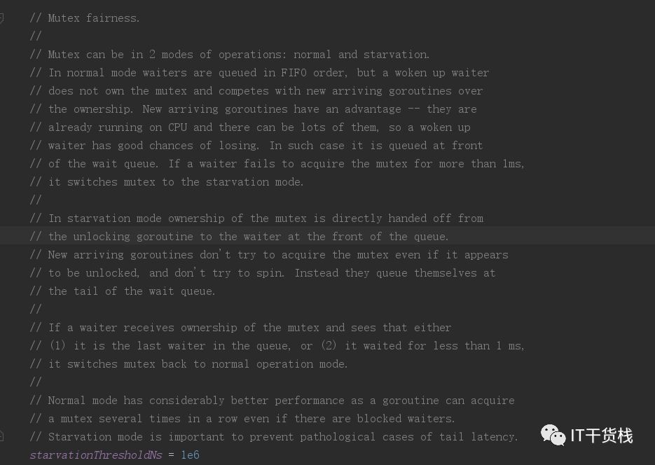 并且在代码中也有很详细的说明,有兴趣的小伙伴可以参考代码源码进行了解。大致的意思就是说互斥锁有两种模式,正常和饥饿模式。