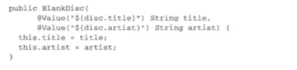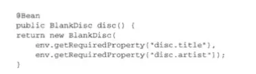 下图展示的spring配置类使用外部的属性来装配BlankDisc bean。