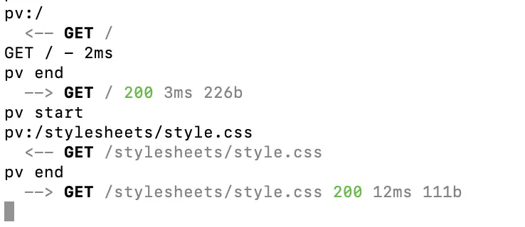 koa-pv.js# mkdir middleware # touch middleware/koa-pv.js function pv(ctx) { global.console.log(`pv:${ctx.path}`) } module.exports = function () { return async function (ctx, next) { global.console.log(`pv start`) pv(ctx) await next() //中间件运行完毕后调用下一个,next相当于触发器 global.console.log(`pv end`) } }app.jsconst Koa = require('koa') const app = new Koa() const pv = require('./middleware/koa-pc') app.use(pv());刷新页面在我们控制台里可以看到我们的刚才中间间中打印出来的内容