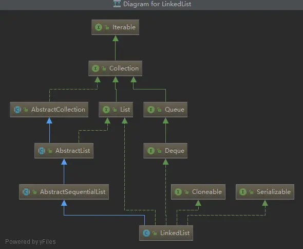 LinkedList继承于AbstractSequentialList抽象类,AbstractSequentialList又继承于AbstractList,最终实现了List的接口,所以LinkedList支持List集合的一些常规操作,但同时LinkedList又实现了Queue接口,所以LinkedList也支持队列的一些使用,例如peek、pop等。
