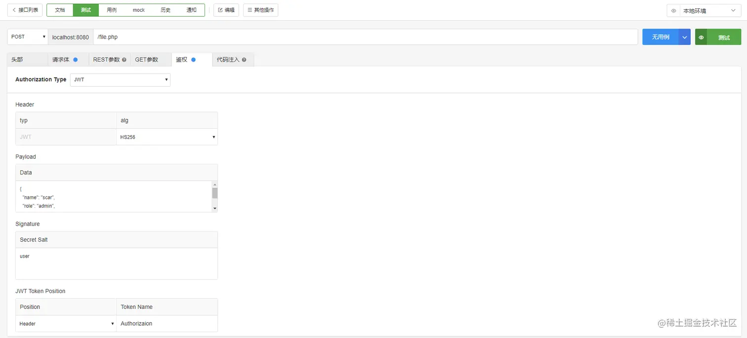 填写好响应的信息,此处我将 JWT 鉴权 Token 放在请求头部的 Authorization 中。