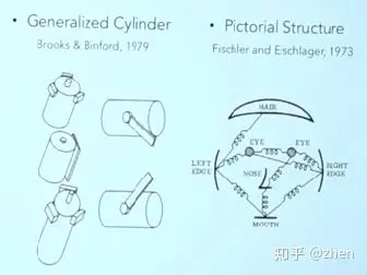 - 斯坦福研究院(SRI)提出的 Pictorial Structure 模型,模型的3D思想比较少,更多的带有概率模型的味道,他也认为世界由简单的物体组成的,物体之间由一些弹簧连接,弹簧可以有一些变形和拉伸。