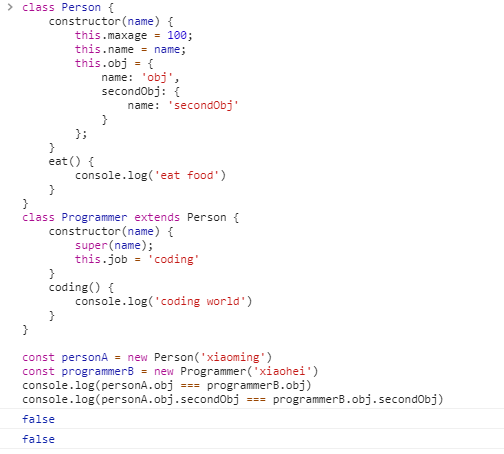 Person 的实例对象上定义了一个 obj 属性,该属性被 Programmer 的实例对象继承,通过对比这两个属性的值,我们知道他们并不相等,这首先排除了是引用复制的可能(如果是引用复制,这里两个属性应该指向同一个对象,也就是其存储的内存地址应该是致的,但是这里得到的结果应该是等式不成立)。通过实例对象属性 obj 中的 secondObj 属性的比较,排除了这是浅拷贝,由此我们可以得出在代码示例的场景中引用类型的继承是通过深拷贝完成的。