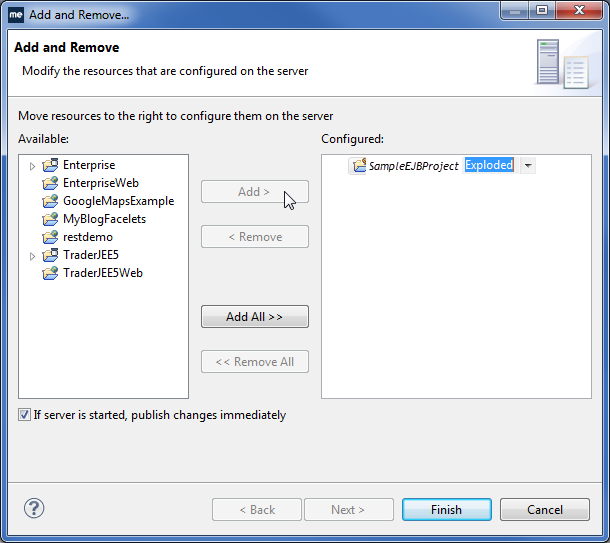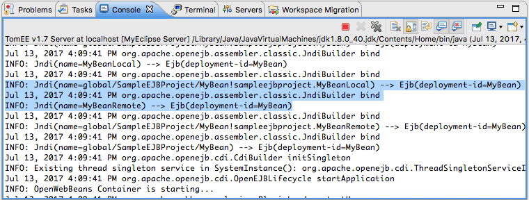 应用程序服务器启动,并向控制台视图显示有关成功部署Session Bean的消息。