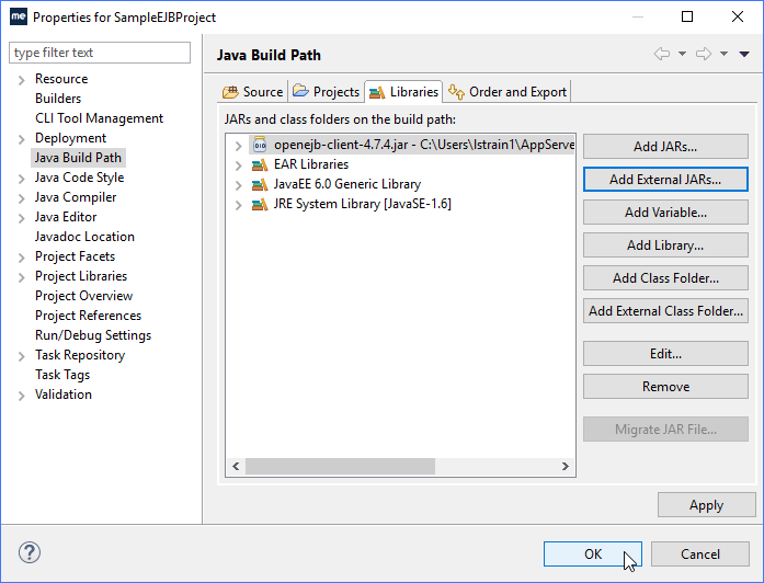 在将代码添加到客户端并运行之前,需要将openejb-client-4.7.4.jar添加到构建路径。下载MyEclipse该JAR来自TomEE库文件夹,是可实现EJB远程调用规范的客户端。