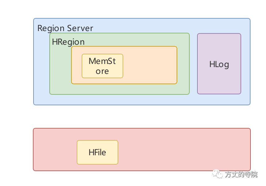 Region ServerRegion Server负责数据的读写,数据存放在内存中,持续化需要和HDFS文件系统进行I/O交互。HBase是列族数据库,列的数据是存放在一起的,不同的行按照row key分布,存储在不同的Region Server中。