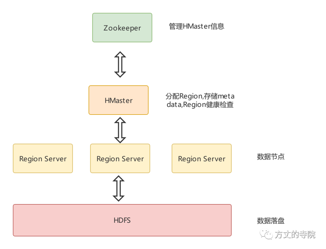 Hbase的集群部署架构模式和Mongo类似,多角色方式。所以读取数据的3跳也比较类似。单节点写入的话和Cassandra类似。