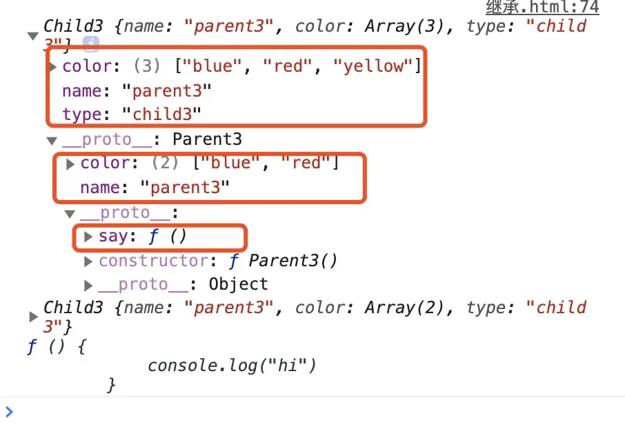 console.log(c1.color, c2.color, c1.say) //["blue", "red", "yellow"] ,["blue", "red"],