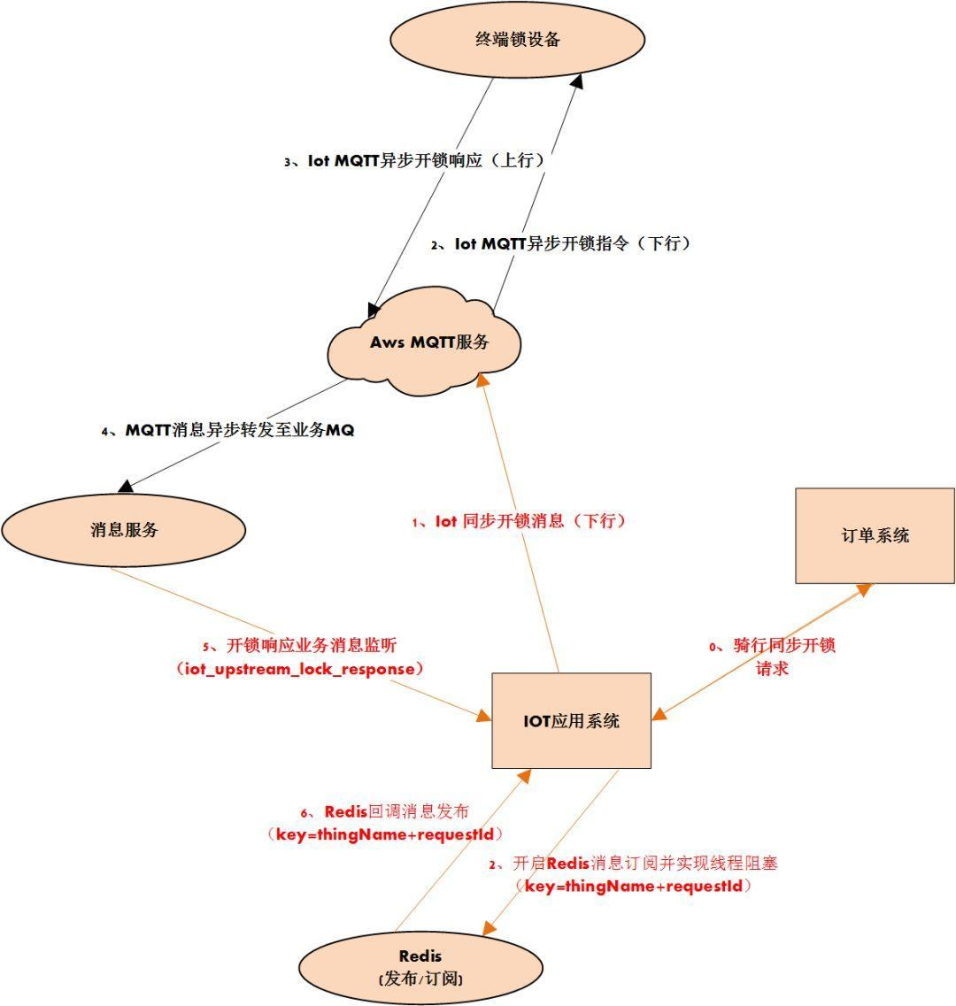 在上述系统流程中,终端设备与服务端之间通过MQTT协议相连,而MQTT协议本质上是一种异步消息的连接方式,因此业务应用(如图中的订单系统)发起开锁请求后,IOT应用系统会以MQTT协议的方式通过物联网平台(此处使用的是AWS IOT服务)向设备发起开锁下行消息,而这一过程在IOT应用系统完成与物联网平台的交互后同步调用链路就结束了,因为物联网平台与锁设备之间通过MQTT消息服务异步解耦了,当然物联网平台会通过一系列可靠消息机制来确保开锁消息能够发送到指定设备的监听MQTT队列。而至于锁设备是否能够及时接收到开锁下行MQTT消息,则取决于锁设备当时的移动网络情况。