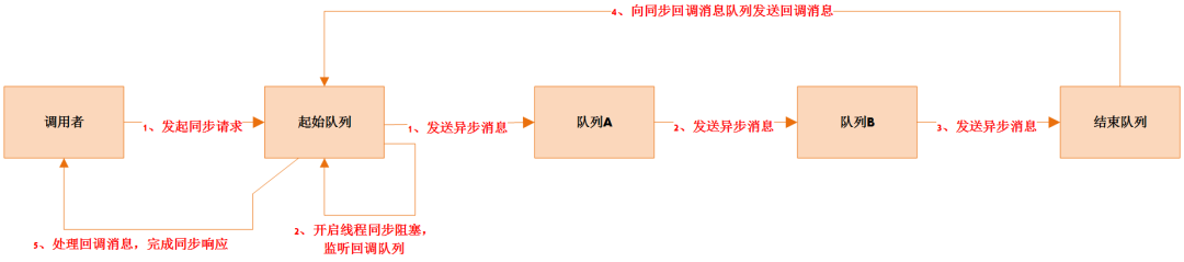 以上问题在使用消息服务进行异步解耦的应用场景中是比较普遍的需求,由于异步调用链路非常长所以通用的解决思路是在调用链的起始端进行同步阻塞,而在调用链的结束端通过回调的方式来实现,如下图所示: