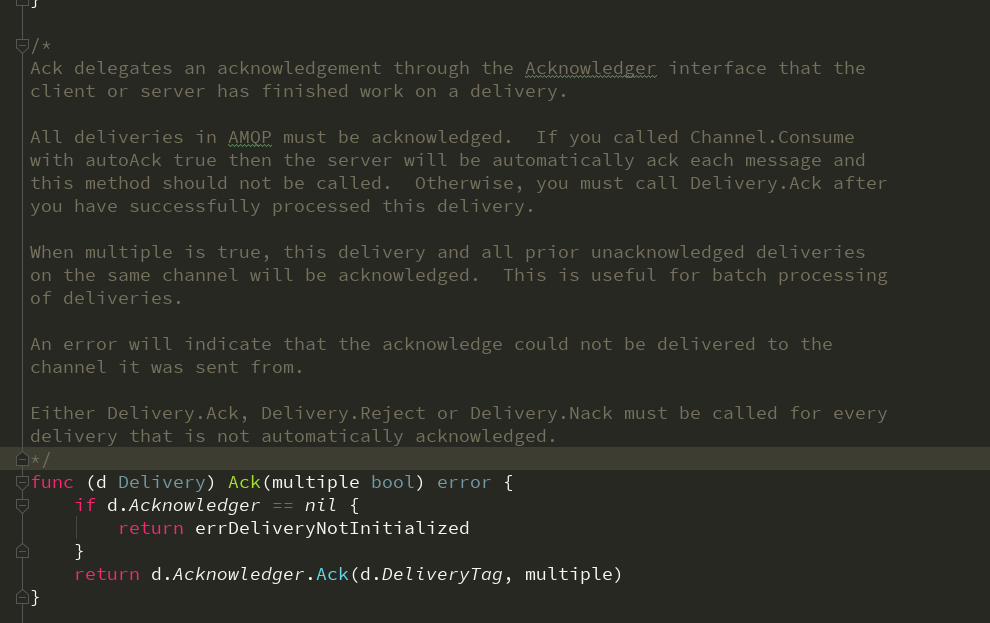 Delivery的定义中有Ack(multiple bool)方法,如下: