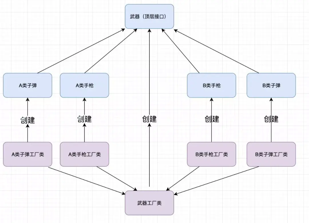 由上图不难得出,虽然武器分为A类和B类,但是从工厂方法模式角度,他们都是属于武器这一层级,这就导致了需要为每一个单独武器指定各自的工厂类,从而导致类数量膨胀问题。