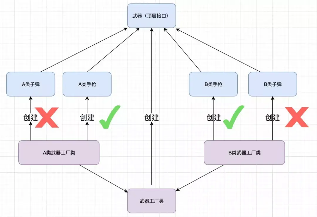 自然会想到,那为什么不单独为每一类武器指定一个工厂类,这样不就可以大幅减少工厂类的数量了吗?如下图。