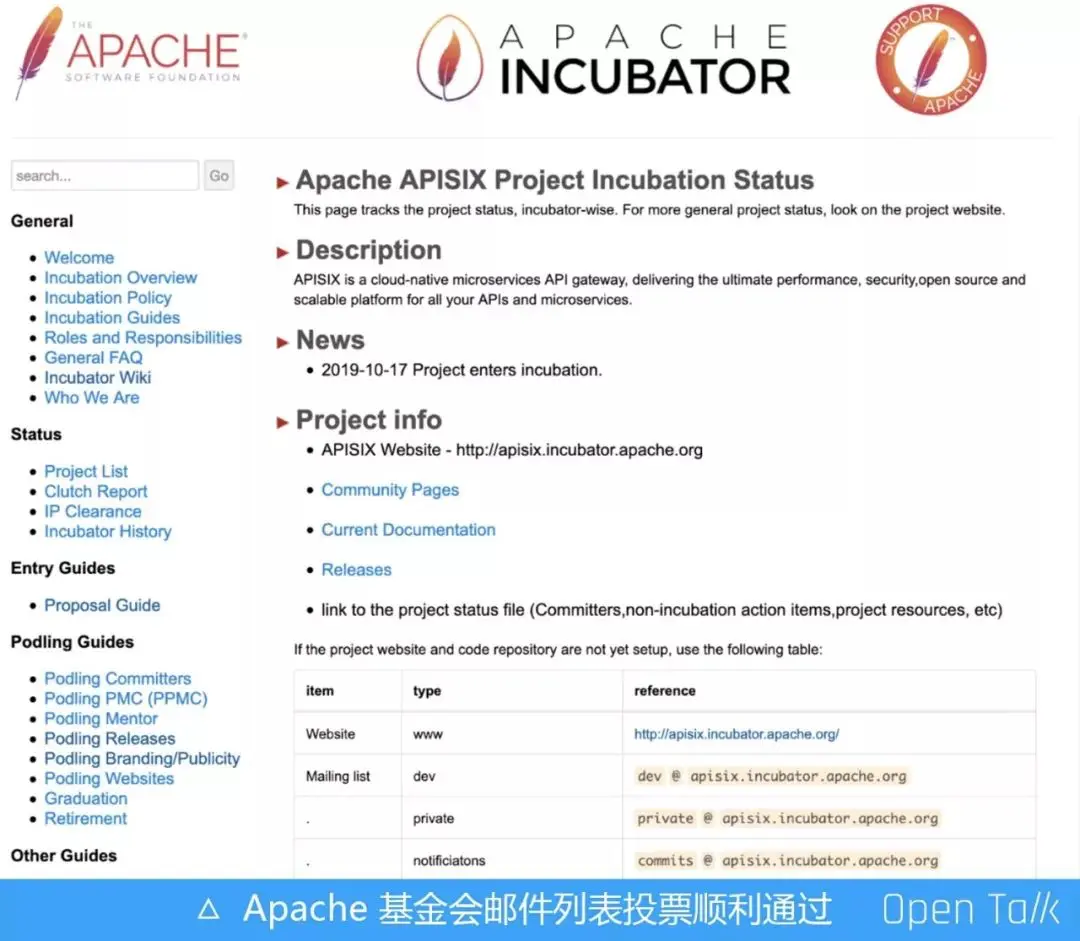 9 月我们也开始和 Apache 接触,着手准备捐赠,10 月就真正成功了。这应该是国内第一家由初创公司捐赠的 Apache 项目。通常一个项目要进入 Apache 基本都是以年为单位,但我们只用了一个月。