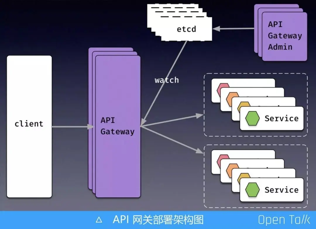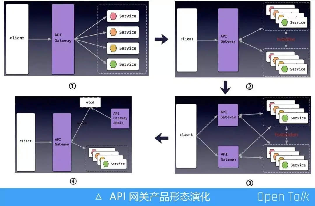 如上图所示,图 ① 为网关最初的产品形态,左侧是客户端,右侧是服务,网关在他们中间;由于服务会做聚集分类,如图 ② 中服务分成两类,此时 API 网关的重要性就体现出来,它需要对外做无感知,需要根据用户请求的流量信息做分发,此时 API 网关就会成为单点故障;由此演化出图 ③ 的形态,有两个 API 网关,它们都可以访问后面的任何一个服务集群,互为备份,是一个高可用的基本形态,客户端可以请求任意一个网关;在图 ④ 中,API Gateway 负责流量转发,etcd 负责配置存储,API Gateway 是管理人员的控制台,所以如果只有 API Gateway 高可用是远远不够的。