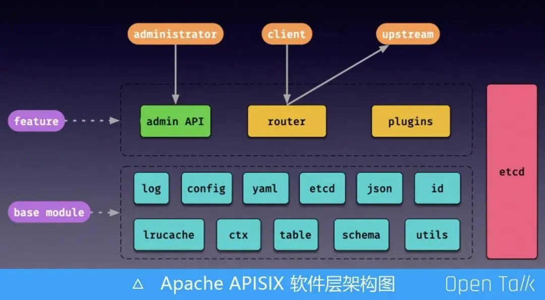 如上图,APISIX 软件层面基本架构并没有采用传统的层层嵌套的方式,只有基础层和业务层,基础层完全脱离于 APISIX 内核,完全无业务绑定,大家可以在任何 OpenResty 项目中引用。