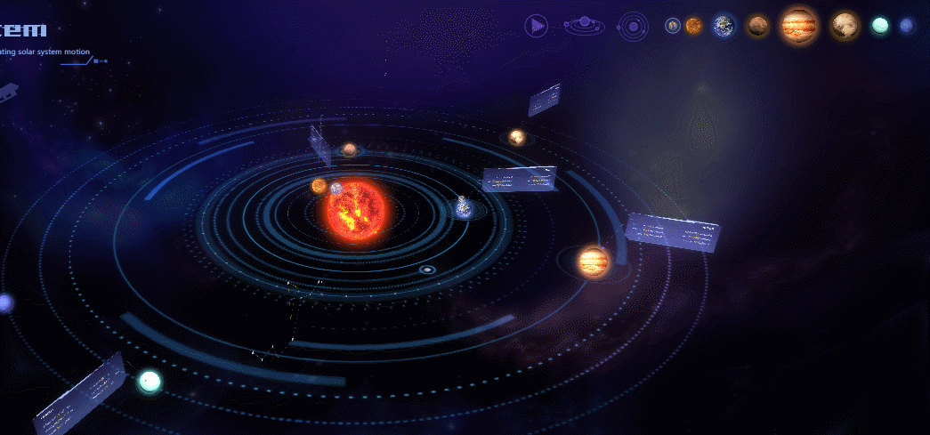 本系统主要展示8大行星绕太阳公转轨道、相对位置、星体质量、资源含量等信息。