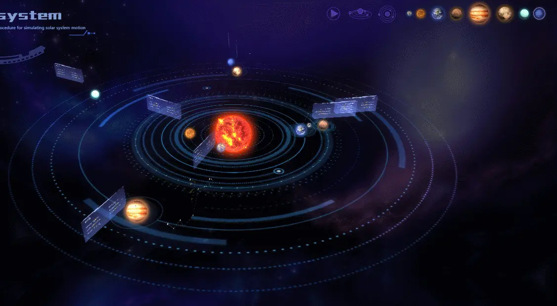 1.作为科研成果、新发现的载体,做 3D 太空数据可视化呈现,用于向普通民众科普太阳系的构成、各行星组织结构等知识,可置于博物馆大屏、学校大屏,也可用于互联网产品,作为航空航天类网站的门户页、展示页。