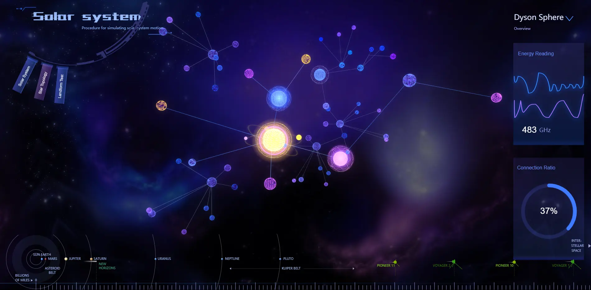 本系统主要展示用户所点选的行星与其它星际物质的相互作用,也可用于展示行星周围卫星的分布情况,以及展示星体间引力、辐射范围等的拓扑结构。