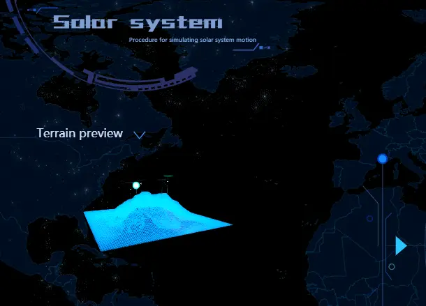 该主题主要用于呈现在场景二中点选的星体上具体的检测点位,点位周边的等高线在左侧自动生成一个 3D 的地形和闪烁的点位示意,并与右侧的检测点位一一对应。