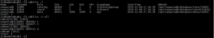 切换到数据库安装用户(默认为sdbadmin用户),查看节点信息和全部节点。