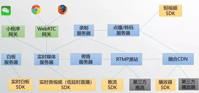 (1)NRTC提供实时音视频与低延时直播功能,这一方案是基于UDP的,低时延流畅,这一能力可以用于音视频交友、在线教学、多人视频会议等多种场景;