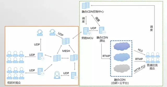 低延时部分无论是否有上行数据,都采用UDP协议接入我们上面提到的低延时网络中,由低延时分发网络来保证所有参与方的低延时体验,如果需要和CDN分发网络融合,会由其中的一个Mesh节点,将所有上行数据发送给旁路MCU服务器,旁路MCU服务器会向融合CDN控制中心请求调度融合CDN源站节点,旁路MCU服务器做音频与视频的混合后,转发给我们的融合CDN源站,由融合CDN源站根据融合CDN的配置情况向一个或者多个CDN推流。