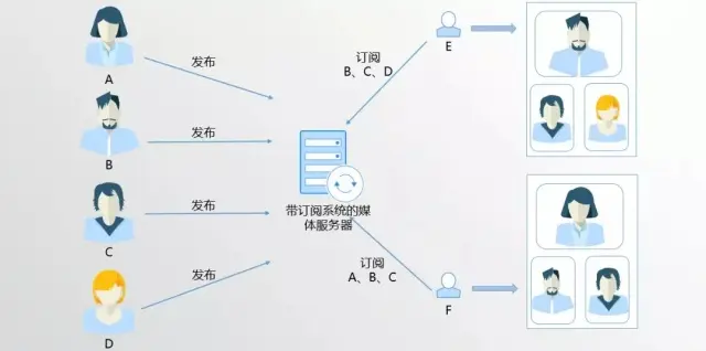 有A、B、C、D、E、F,每个人都可以发布自己的视频,这些发布消息会在媒体服务器上做汇总,然后分发给每一个与会者。如图E选择订阅B/C/D,那么媒体服务器就会根据E的订阅请求将B/C/D的媒体包转发给E,同理F可以做出不同订阅,他订阅A/B/C,那媒体服务器就只会将A/B/C三个用户的媒体包转发给F。