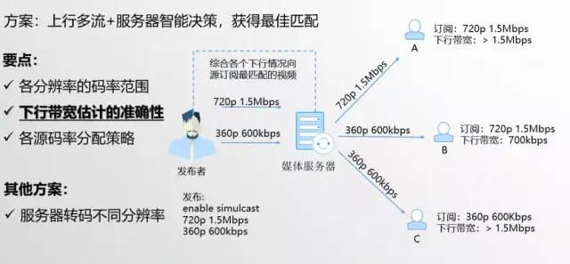 这个方案的要点是,服务器需要有各个分辨率的码率范围,同时下行带宽需要估计准确,在服务器上根据各个下行的带宽和用户的具体订阅需求进行分配。同时服务器需要兼容上行网络变差时,发布者将多流切为单流的情况,此时在传输协议设计时需要考虑如何可以方便服务器做出正常的选路,这也是我们前面谈到的传输协议需要可以描述多流能力的原因。