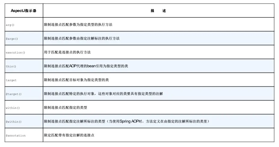 Spring AOP所支持的AspectJ切点指示器: