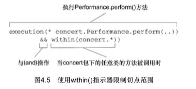 请注意我们使用了“&&”操作符把execution()和within()指示器连接在一起形成与(and)关系(切点必须匹配所有的指示器)。类似地,我们可以使用“||”操作符来标识或(or)关系,而使用“!”操作符来标识非(not)操作。