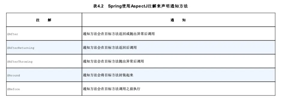 AspectJ提供了五个注解来定义通知,如表4.2所示。