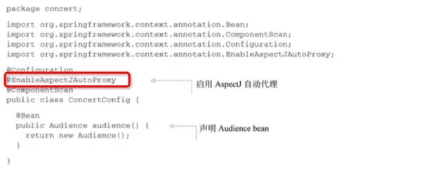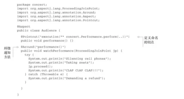 Audience类使用@AspectJ注解进行了标注。该注解表明Audience不仅仅是一个POJO,还是一个切面。Audience类中的方法都使用注 解来定义切面的具体行为。