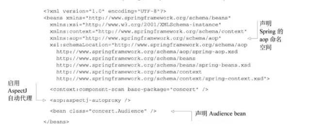 用Spring aop命名空间中的一些元素,将没有注解的Audience类转换为切面。