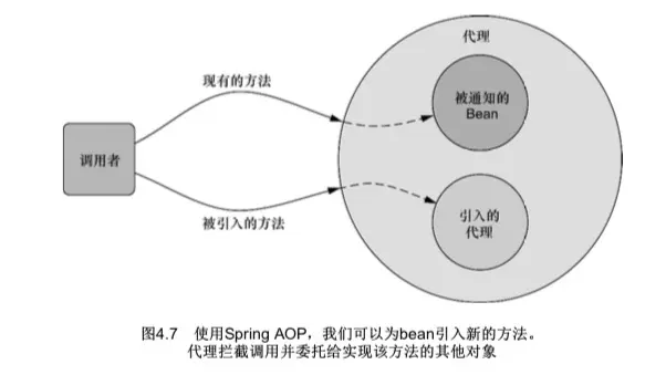 Spring的自动代理机制将会获取到它的声明,当Spring发现一个bean使用了@Aspect注解时,Spring就会创建一个代理,然后将调用委托给被代理的bean或被引入的实现,这取决于调用的方法属于被代理的bean还是属于被引入的接口。