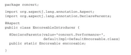 EncoreableIntroducer是一个切面。但是,它与我们之前所创建的切面不同,它并没有提供前置、后置或环绕通知,而是通过@DeclareParents注解,将Encoreable接口引入到Performance bean中。
