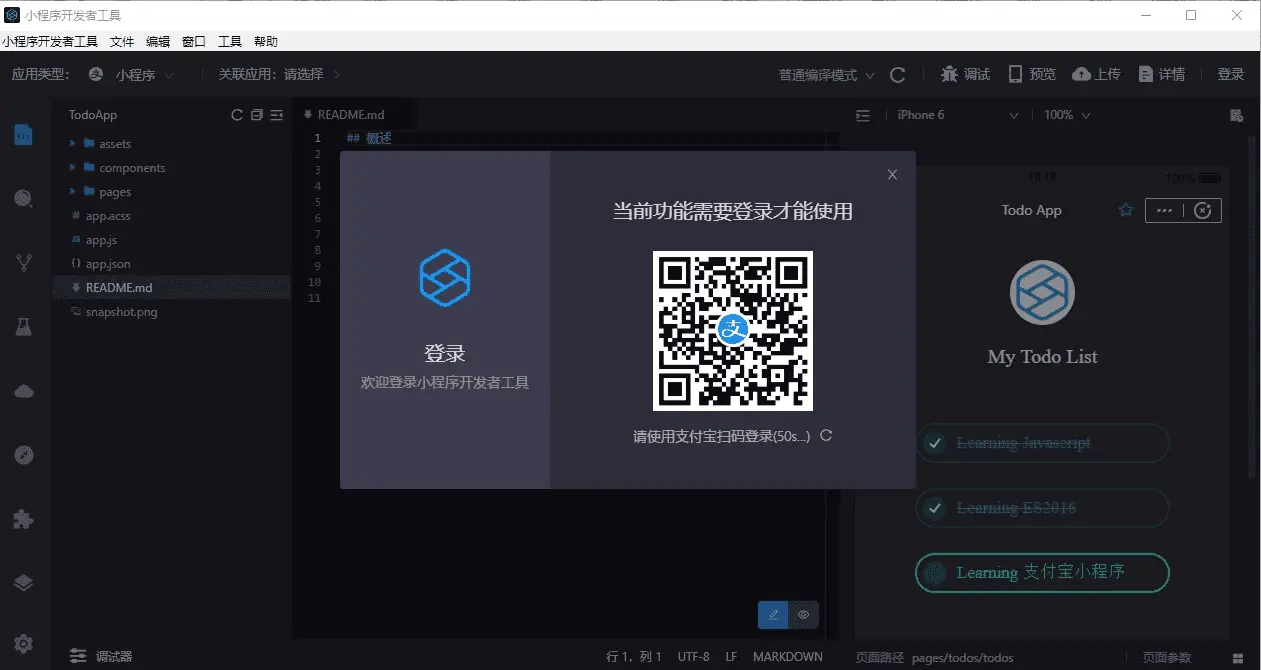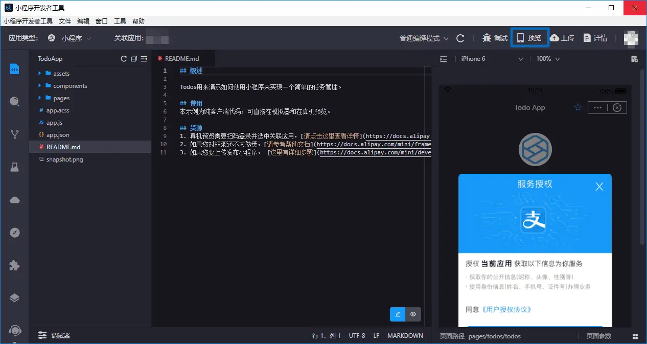 - 使用手机支付宝扫码登录开发者工具,并允许关联支付宝小程序。