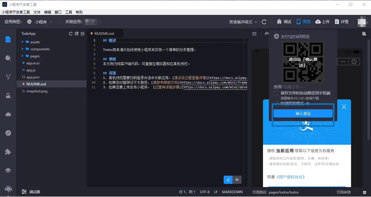 - 点击 确认推送,即可在手机上运行和预览小程序了。