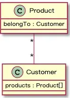 下图表示消费者会拥有很多个商品, 商品也可以关联消费者, 这就是双向的关系, 没有箭头表默认, 默认双向