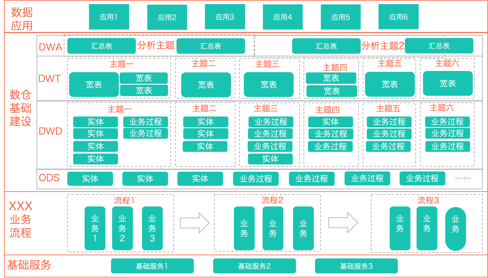 - 正常流向:ODS>DWD->DWT->DWA->APP,当出现ODS >DWD->DWA->APP这种关系时,说明主题域未覆盖全。应将DWD数据落到DWT中,对于使用频度非常低的表允许DWD->DWA。 尽量避免出现DWA宽表中使用DWD又使用(该DWD所归属主题域)DWT的表。