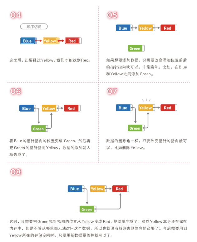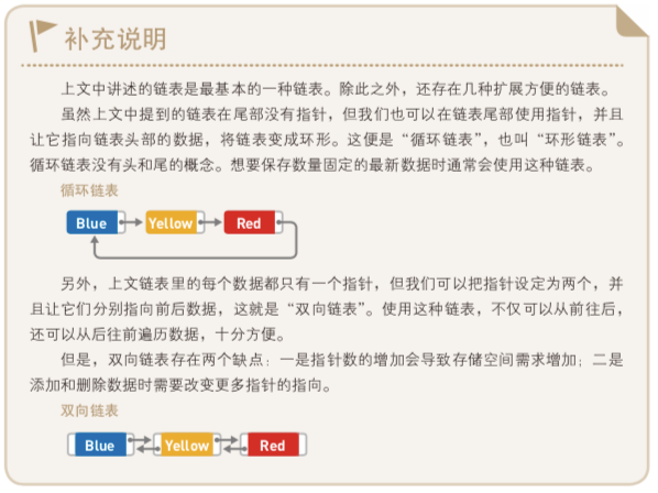 另外,添加数据只需要更改两个指针的指向,所以耗费的时间与 n 无关。如果已 经到达了添加数据的位置,那么添加操作只需花费 O(1) 的时间。删除数据同样也只需 O(1) 的时间。