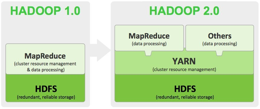 我们知道程序运行在集群中是要耗费资源的,比如cpu,内存,IO···等,在hadoop1.x的时候,其实这个分配资源的行为(上图的cluster resource management)也是MapReduce自行完成的。在集群规模大,应用多时,MapReduce较为容易成为系统瓶颈。所以在hadoop2.x的时候,就引入了Yarn,而负责存储的HDFS和负责计算的MapReduce则不变。
