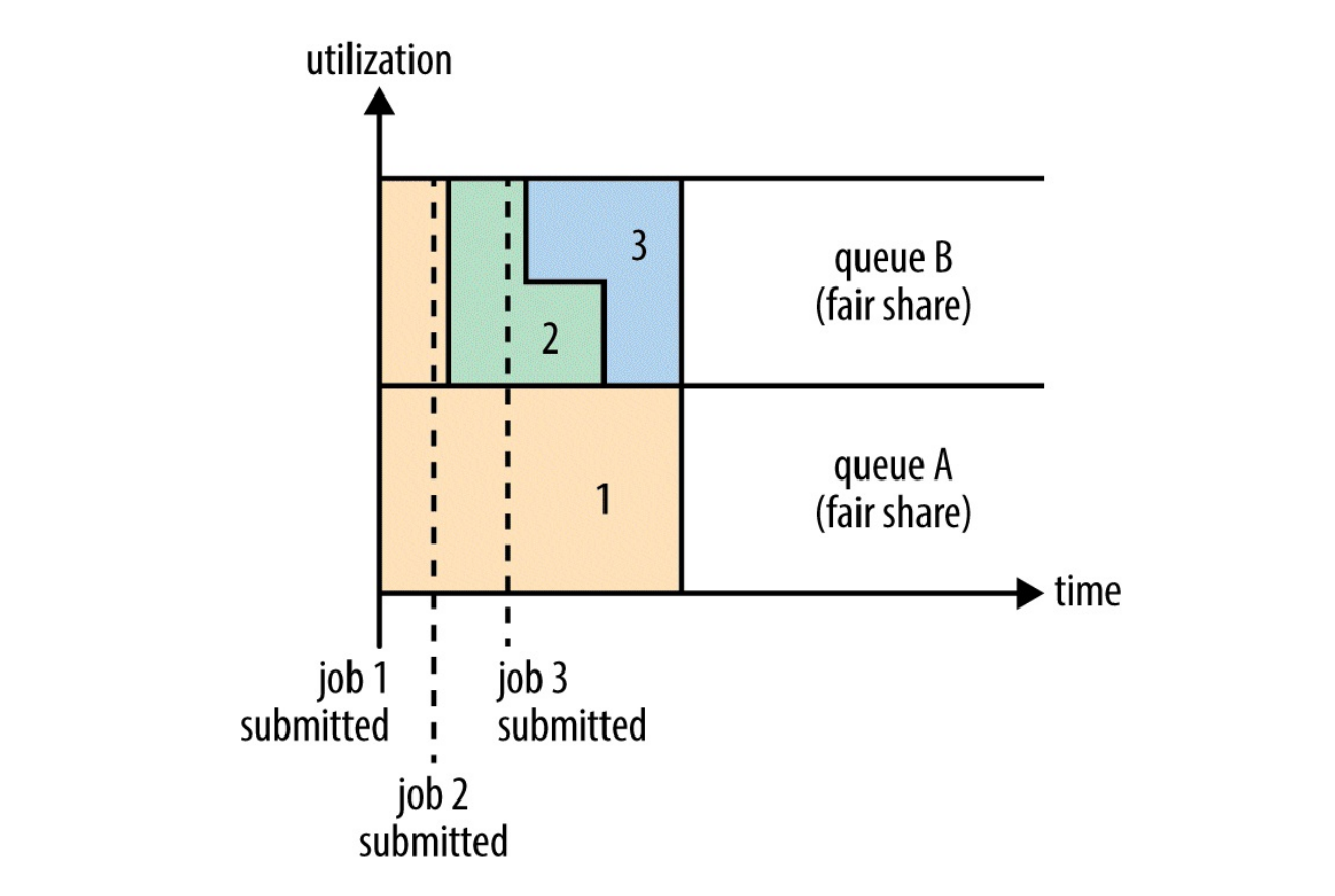 需要注意的是,在下图Fair调度器中,从第二个任务提交到获得资源会有一定的延迟,因为它需要等待第一个任务释放占用的Container。小任务执行完成之后也会释放自己占用的资源,大任务又获得了全部的系统资源。最终的效果就是Fair调度器即得到了高的资源利用率又能保证小任务及时完成.