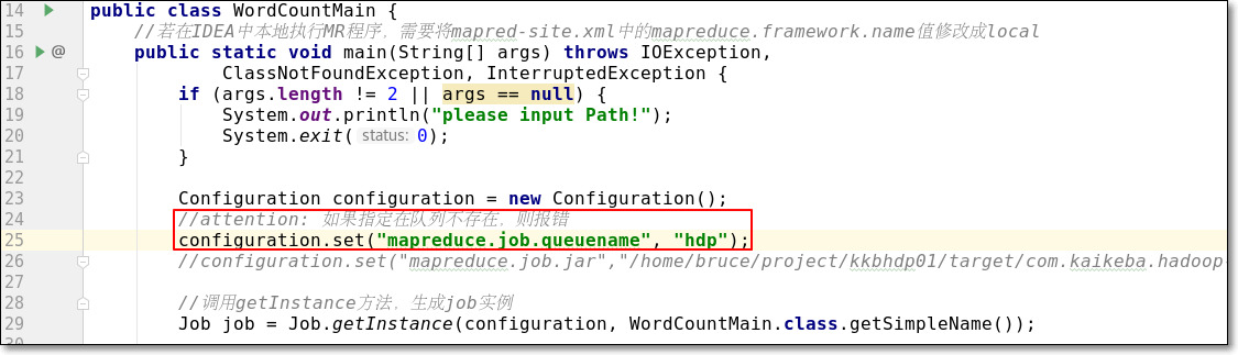 例如MR,可以通过设置属性mapreduce.job.queuename指定相应队列。以WordCount为例,如下