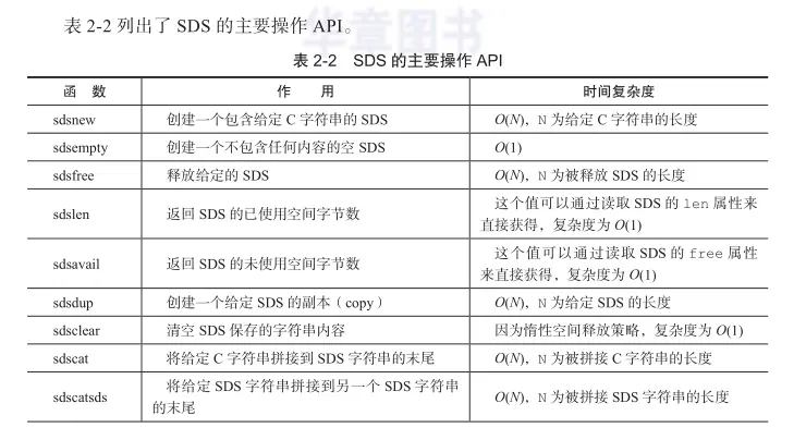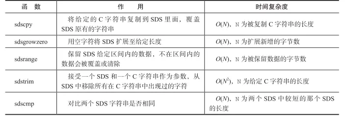 **注:**在保存空字符('\0'字符)空间不计算在SDS的len属性中,为空字符分配额外的1字节空间。对于空字符到字符串末尾等操作,均由SDS函数自动完成。遵循这一惯例,好处是SDS可以直接重用一部分C字符创函数库中的函数。