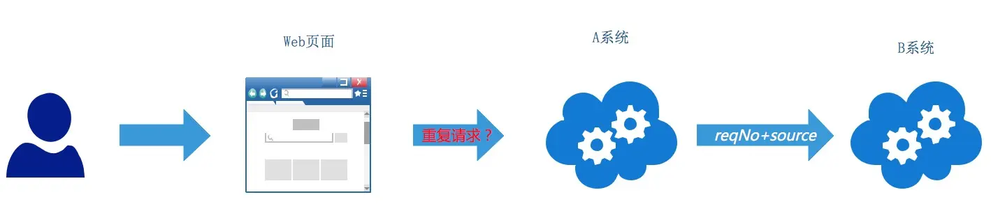 在一条调用链路的后端系统中,一般都可以通过上游系统传递的reqNo+source来识别是否是为重复的请求。如下图,B系统是依赖于A系统传递的reqNo+source来识别相同请求的,但是A系统是直接和前端页面交互的系统,如何识别用户发起的请求是相同的呢?比如用户在支付界面上点击了多次,A系统怎么识别这是一次重复操作呢?