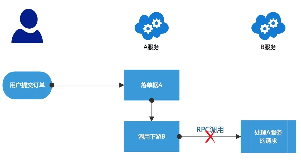 分布式系统由众多微服务组成,微服务之间必然存在大量的网络调用。下图是一个服务间调用异常的例子,用户提交订单之后,请求到A服务,A服务落单之后,开始调用B服务,但是在A调用B的过程中,存在很多不确定性,例如B服务执行超时了,RPC直接返回A请求超时了,然后A返回给用户一些错误提示,但实际情况是B有可能执行是成功的,只是执行时间过长而已。
