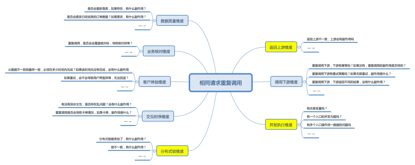 (1)调用下游维度:重复调用下游会怎样?如果下游没有幂等,重复调用会带来什么副作用?